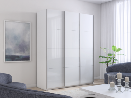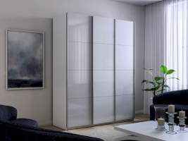 Шкаф-купе 3-х дверный Прайм Белое стекло/Белое стекло/Белое стекло 1800 мм Белый снег