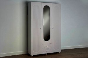 Шкаф оснащён тремя распашными дверями: две крайние двери выполнены из МДФ, а средняя дверь дополнена зеркалом, которое визуально расширяет пространство и делает комнату светлее. В нижней части предусмотрены два выкатных ящика, подходящих для хранения белья, аксессуаров или повседневных вещей.