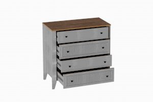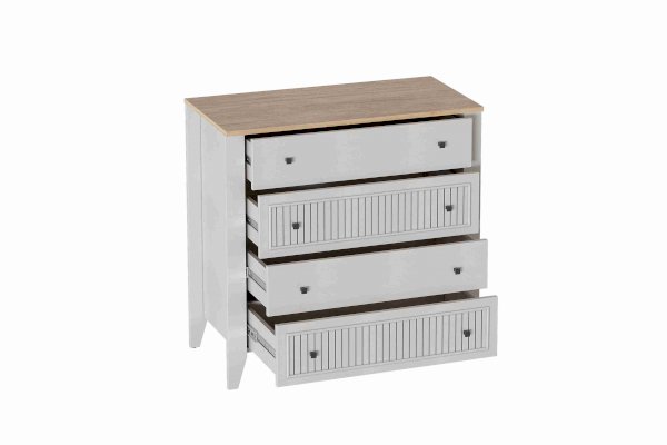 Комод с 4 ящиками Валенсия выполнен из ЛДСП в комбинации Дуб натуральный светлый/Персидский жемчуг.