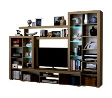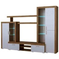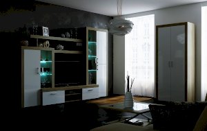Гостиная "Орландо" с 2-мя ящиками на роликовых направляющих. Корпус гостиной обрамлён профилем MDF оригинальной формы. Опционально возможна установка светодиодной подсветки для стеклополок в витринах гостиной.