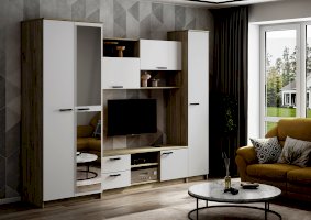 • Гостиная состоит из трёх модулей (шкаф платяной, шкаф бельевой, средняя секция), которые при желании можно устанавливать отдельно друг от друга, размещая в разных комнатах