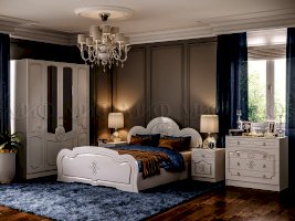 Мебель для спальни «Каролина» отличается плавными, обтекаемыми формами кровати, идеально сочетающимися с красивой фрезеровкой шкафа, комода и прикроватных тумб. Цветовая гамма хорошо вписывается в интерьер. Спальня выглядит роскошно, демонстрируя статус и достаток хозяев. Все предметы мебели идеально гармонируют друг с другом , придавая спальне особый шарм и элегантность.