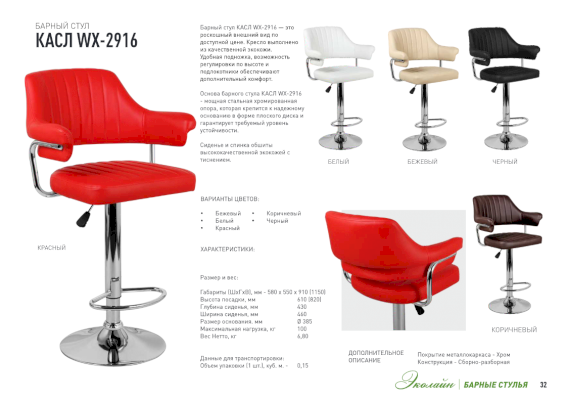 Барный стул КАСЛ WX-2916 со спинкой непременно придется вам по вкусу и создаст в кафе неповторимую атмосферу. Основа барного стула КАСЛ WX-2916 - мощная стальная хромированная опора, которая крепится к надежному основанию в форме плоского диска и гарантирует требуемый уровень устойчивости. Мягкие формы сидения и стеганой спинки обеспечат посетителю комфорт.